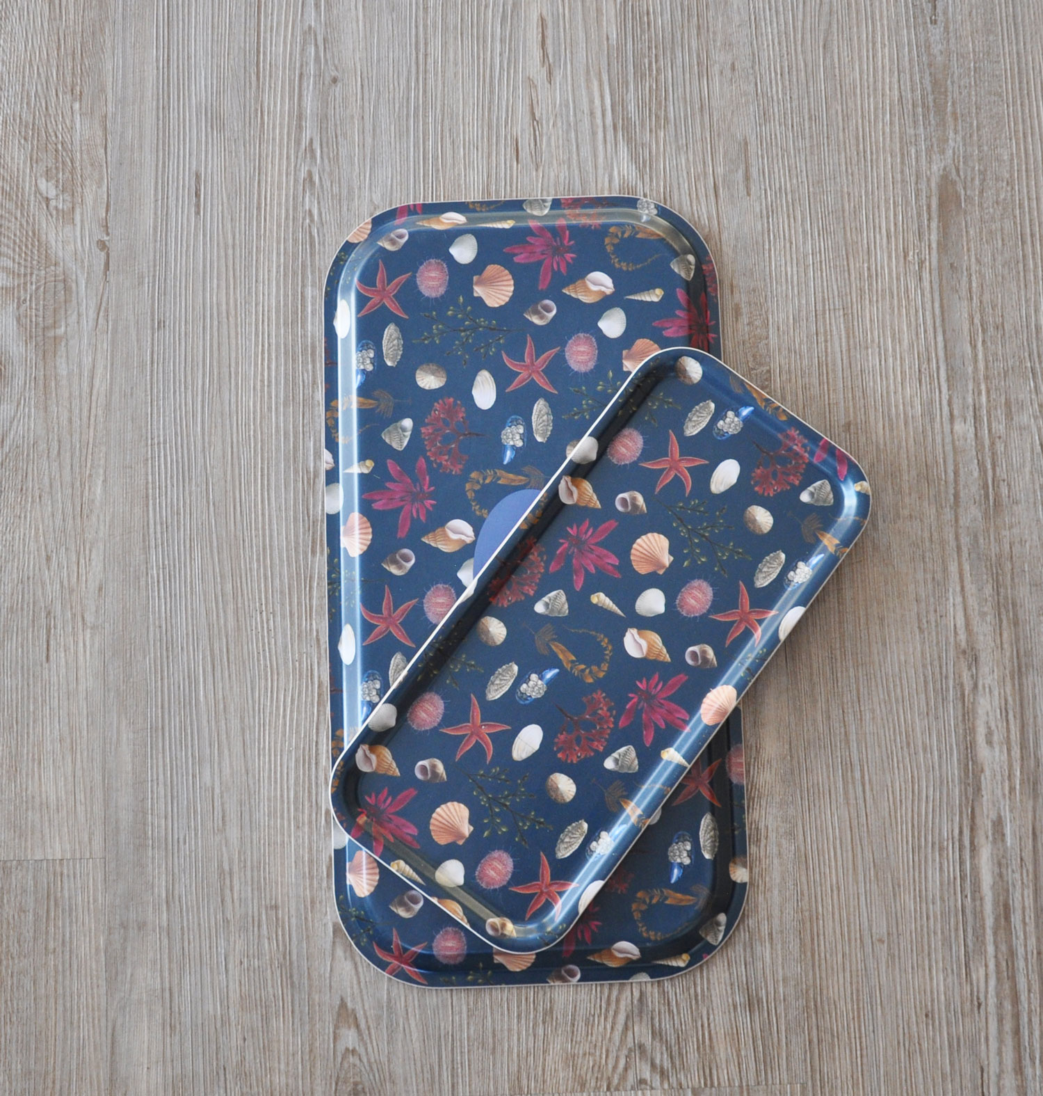 Bakke af birkefiner er bæredygtigt produceret. Materialet er formpresset finér af birk fra Norden. Bakkerne er i 2 forskellige størrelser og med flotte motiver i fine afstemte farver. De passer også fint sammen i sæt. Motivet med strandting på den lille bakke går igen på undersiden af den blå med striber. Den lille bakke med citroner har grønne striber på undersiden, og den store med de samme striber har citroner på undersiden. Bakken med fuglemotiv har også fugle på undersiden.