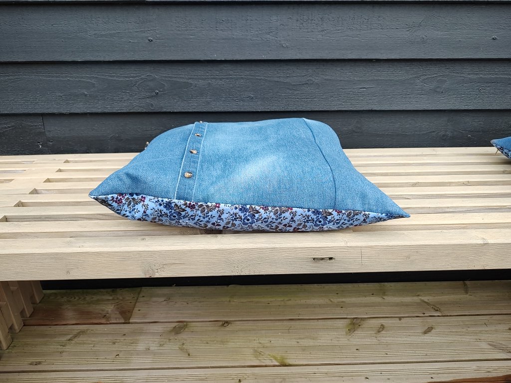 Pude blå/natur inklusiv monteringspude. Alle puderne her er syede af materialer fra genbrug. Det kan være rester af møbelstof eller anden boligtekstil fundet i en genbrugsforretning. Ofte er det også stof fra kjoler eller store trøjer og duge, tæpper eller sengetøj, vi anvender. Monteringspuderne er også fundet i genbrugsforretninger, og de er med dunfyld. Vores puder har helt individuelle størrelser, da de er syet til de forskellige monteringspuder, som har helt vilkårlige mål. Der findes masser af brugte puder, som er blevet kasserede. Det kan enten være på grund af slidtage, eller fordi de er beskidte. Ofte handler det også om mode indenfor bolig og indretning, og de puder, man har, synes man måske er blevet umoderne. På vores systue fjerner vi betrækket og syr et nyt til puden ud af genbrugsmaterialer. Puderne er altid forsynede med enten lynlås eller knapper, så man kan tage betrækket af for at vaske det, hvis der er behov for det.