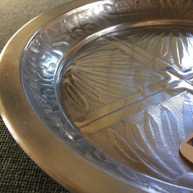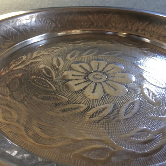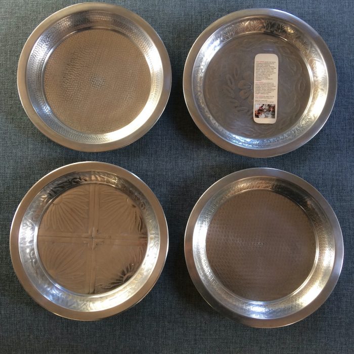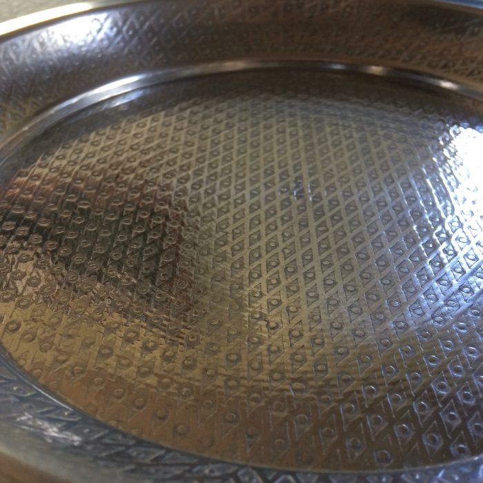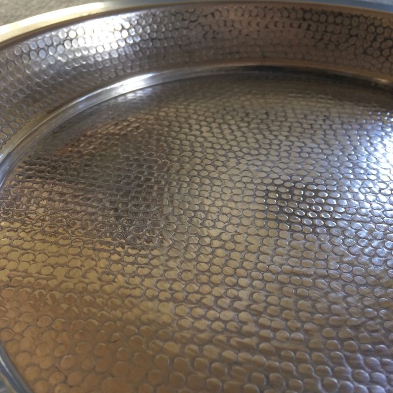 Rund bakke fra det hollandske importørfirma Van Verre er fremstillet i Indien af metalhåndværkere i Moradabad-området. Pladerne er lavet af aluminium i forskellige designs og med en matteret overflade.