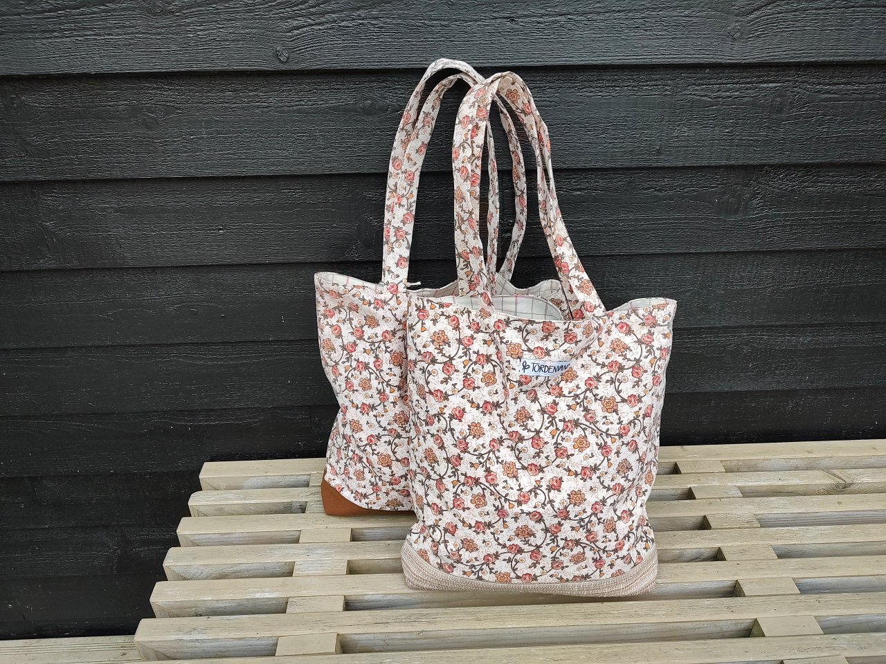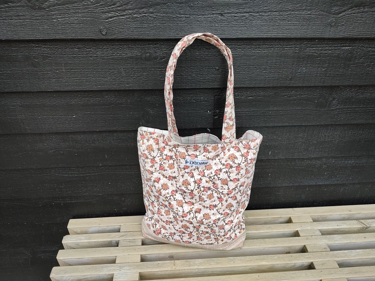 Upcycled taske m. blomster i 2 lags stof med forstærkninger. Tasken egner sig godt til indkøb, PC, bøger el. lign. Eller brug tasken som en gave til én, du holder af. Tasken er helt unik og fremstillet af genbrugstekstil. Den er håndlavet i Danmark på vores egen systue i Agger lidt uden for Nationalpark Thy. Den er upcycled af rester fra systuen samt tøj, duge og lignende fra genbrug. Indkøbsnet eller indkøbstasker har fået en hel renæssance i Danmark, hvor det efterhånden er blevet standard, at man selv har et net med, når man er på indkøb.
