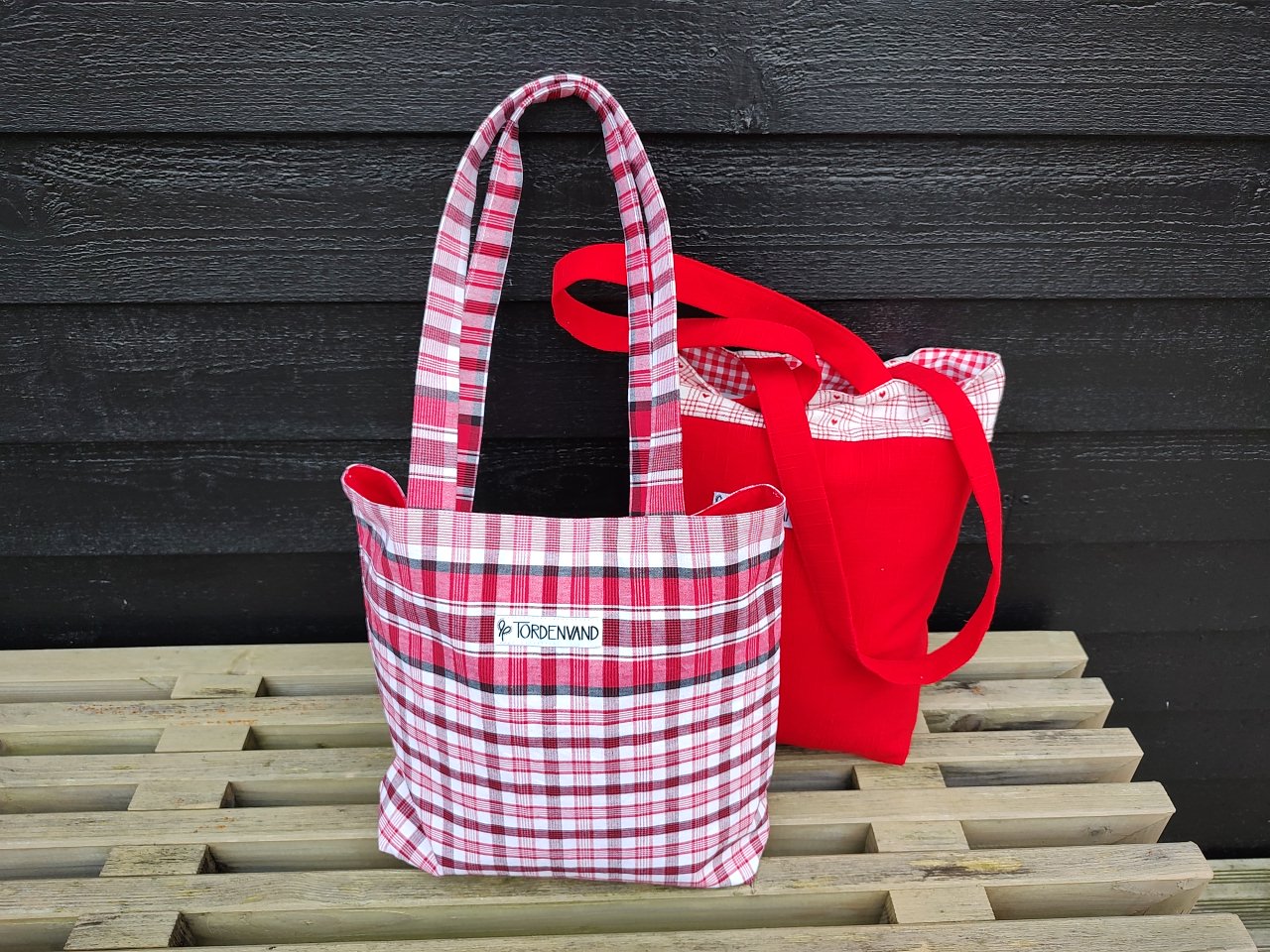 Upcycled taske rød til ethvert formål. Vores tasker fra Tordenvand er upcycled og syet af materialer fra genbrug samt rester fra systuen. Alle tasker er desuden foret, så de bliver mere holdbare. Hankene er forstærkede og i flere lag, hvilket gør, at de stadig er behagelige at bære, selvom taskens indhold vejer godt til. Brug tasken til fx indkøb, bøger, træningstøj, bærbar computer og meget andet.
